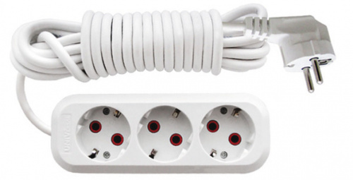 Удлинитель электрический «UNIVersal» серии «Люкс» провод ГОСТ марки ПВС (3*0,75), 3 гнезда, предназначен для подключения электроприборов различного назначения. Напряжение в сети 220/250 В, частота тока 50 Гц, максимальная мощность 2200 Вт, номинальный ток 10 А, материал корпуса полистирол.