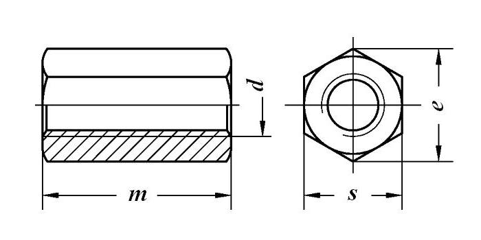 Соединительная удлиненная гайка применяется для конструкционного соединения резьбовых частей болтов, шпилек и т.д. в машиностроении, приборостроени и строительстве в качестве детали соединения. Материал - сталь, гальваническое оцинкование