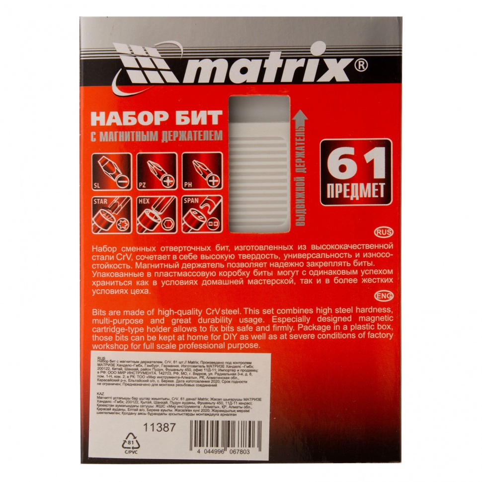 Набор Matrix 11387 состоит из 61 предмета: 60 бит из стали CrV и магнитного держателя. Включает сразу несколько типоразмеров бит длиной 25 мм: SL калибров 3, 4, 5, 5,5, 6, 7, 8; PZ и PH № 0-3, HEX № 1,5, 1,5, 2, 2,5, 3, 3,5, 4, 4,5, 5, 5,5, 6, 7, 8; TORX 5, 6, 8, 9, 10, 15, 20, 27, 30, 35, 40; Spanner калибров 4, 6, 8, 10; TORX Tamper 10, 15, 20, 25, 27, 30, 35; HS № 2, 2,5, 3, 4, 5, 6. Насадки используются в качестве оснастки на шуруповертах и реверсивных отвертках, применяются для монтажа и демонтажа резьбовых крепежей.