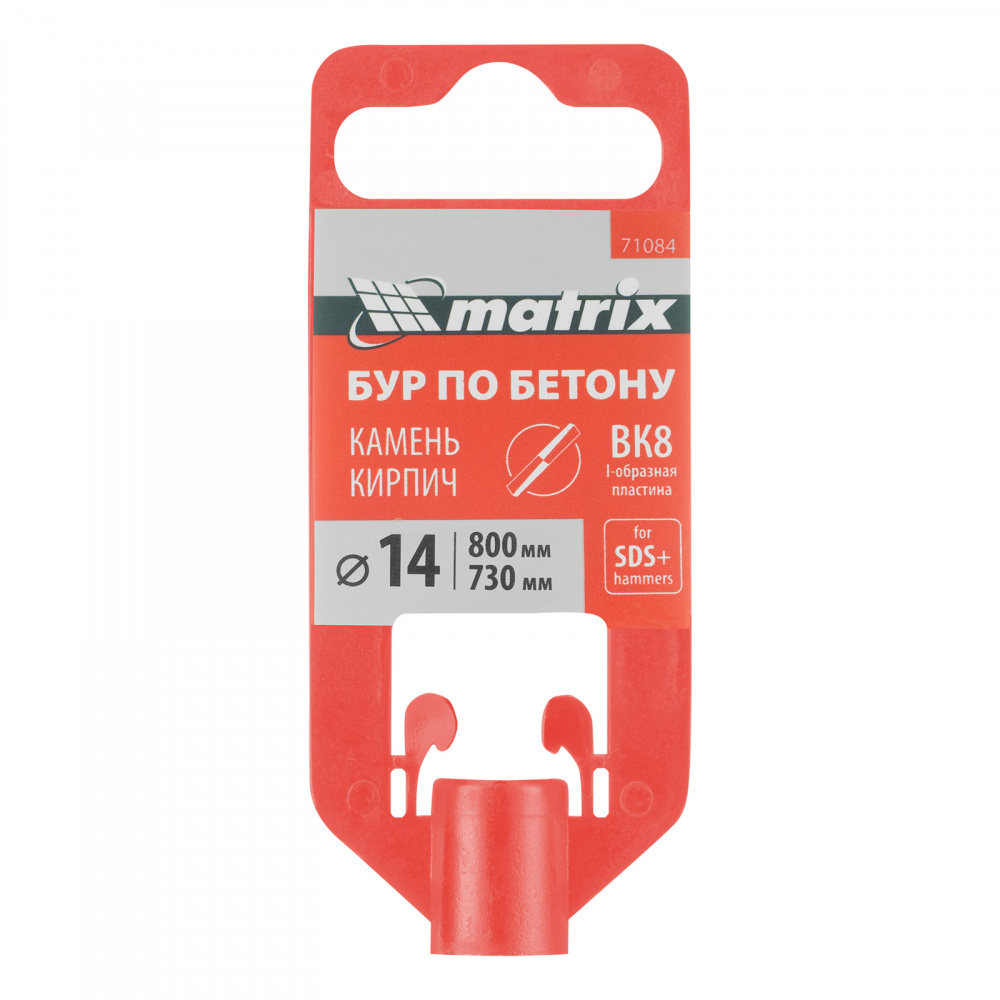 Бур по бетону Matrix 71084 длиной 800 мм, с хвостовиком SDS-plus, предназначен для установки на перфоратор и получения отверстий диаметром 14 мм в бетоне, камне и кирпиче. Позволяет эффективно решать поставленные задачи благодаря режущей пластине из высокотвердого сплава карбида вольфрама ВК8 твердостью 80-90 HRC.