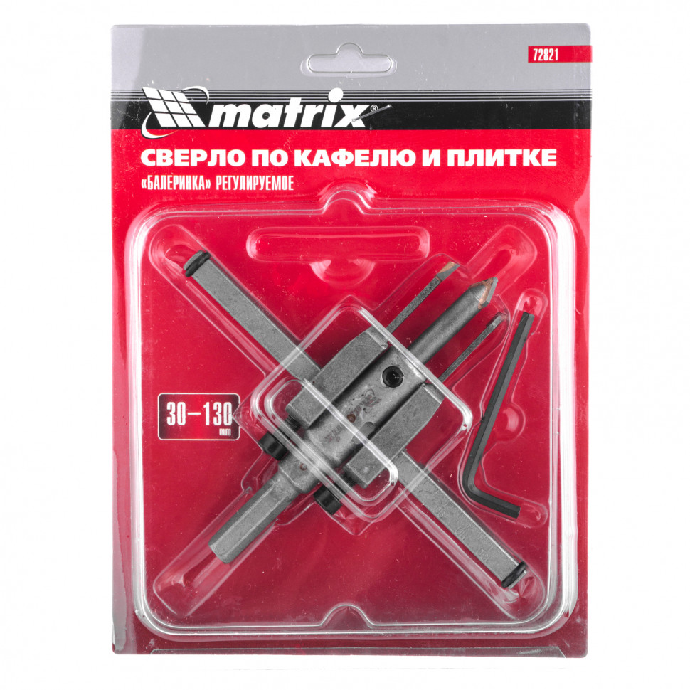 Сверло Matrix «Балеринка» 72821, регулируемое в диапазоне 30-130 мм, предназначено для получения отверстий толщиной 4-12 мм в керамике, кафеле, кирпиче, плитке и других материалах. Устанавливается в патрон дрели. Используется как начинающими мастерами, так и профессионалами.