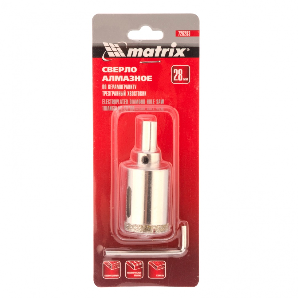 Универсальное алмазное сверло по керамограниту Matrix 726283 размером 28 х 67 мм, с 3-гранным хвостовиком, применяется для получения отверстий в стекле, плитке, кафеле. За счет высокой концентрации алмазов в режущем слое оно легко справляется со сверлением керамогранита. Сверло рассчитано на профессиональное использование с дрелями и шуруповертами. Водяное охлаждение в процессе работы значительно повышает срок службы оснастки.