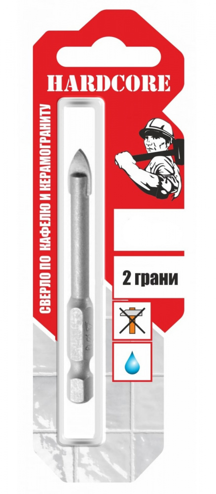 Сверло диаметром 10 мм торговой марки Hardcore используется для работы с керамической плиткой, керамогранитом, облицовочным камнем и стеклом. Сверло с твердосплавной режущей частью специальной формы имеет никелированную поверхность. Наилучшие результаты сверления достигаются при низкой скорости вращения и достаточном охлаждении водой. При невозможности организовать струю воды, сверло нужно окунать в ёмкость с водой каждые 10 секунд, место сверления смачивать губкой. Сверлить на невысоких оборотах дрели.