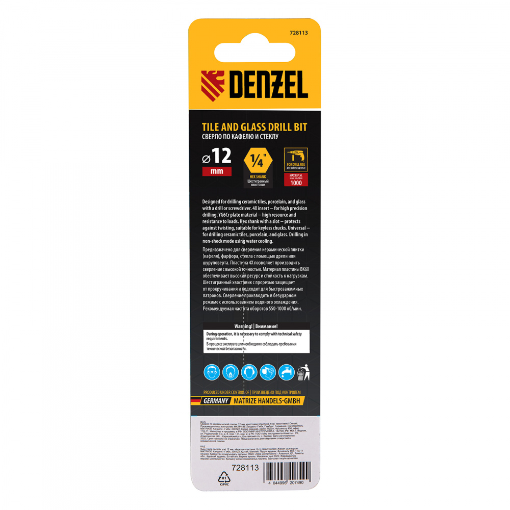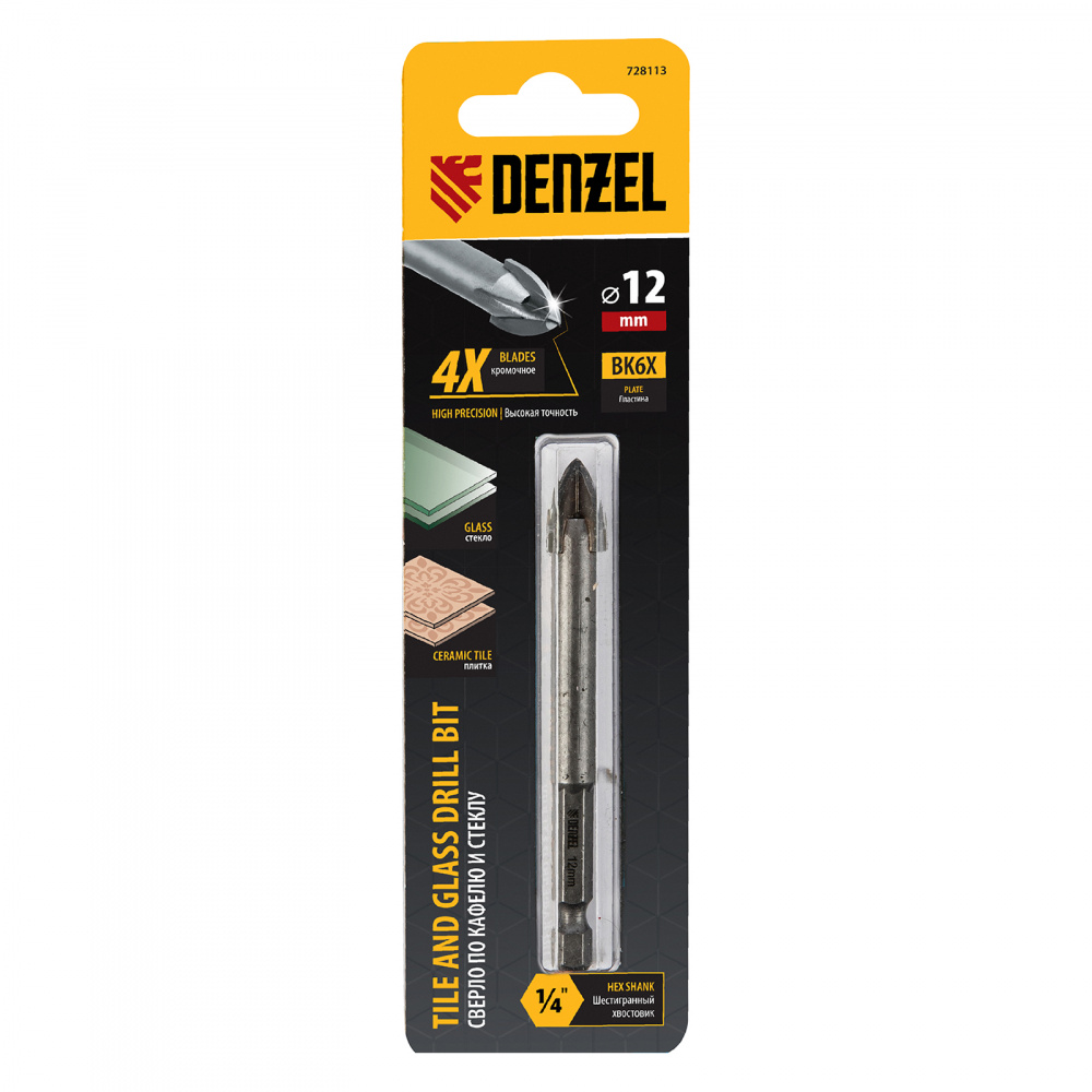 Сверло Denzel 728113, 12 мм, с крестовой пластинкой и шестигранным хвостовиком, рассчитано на сверление керамической плитки, стекла, мрамора и фарфора. Благодаря 4-гранной режущей пластине оно обеспечивает высокую скорость засверливания. Сверло подходит для интенсивного профессионального использования. В процессе работы рекомендуется применять водяное охлаждение для увеличения ресурса сверла.