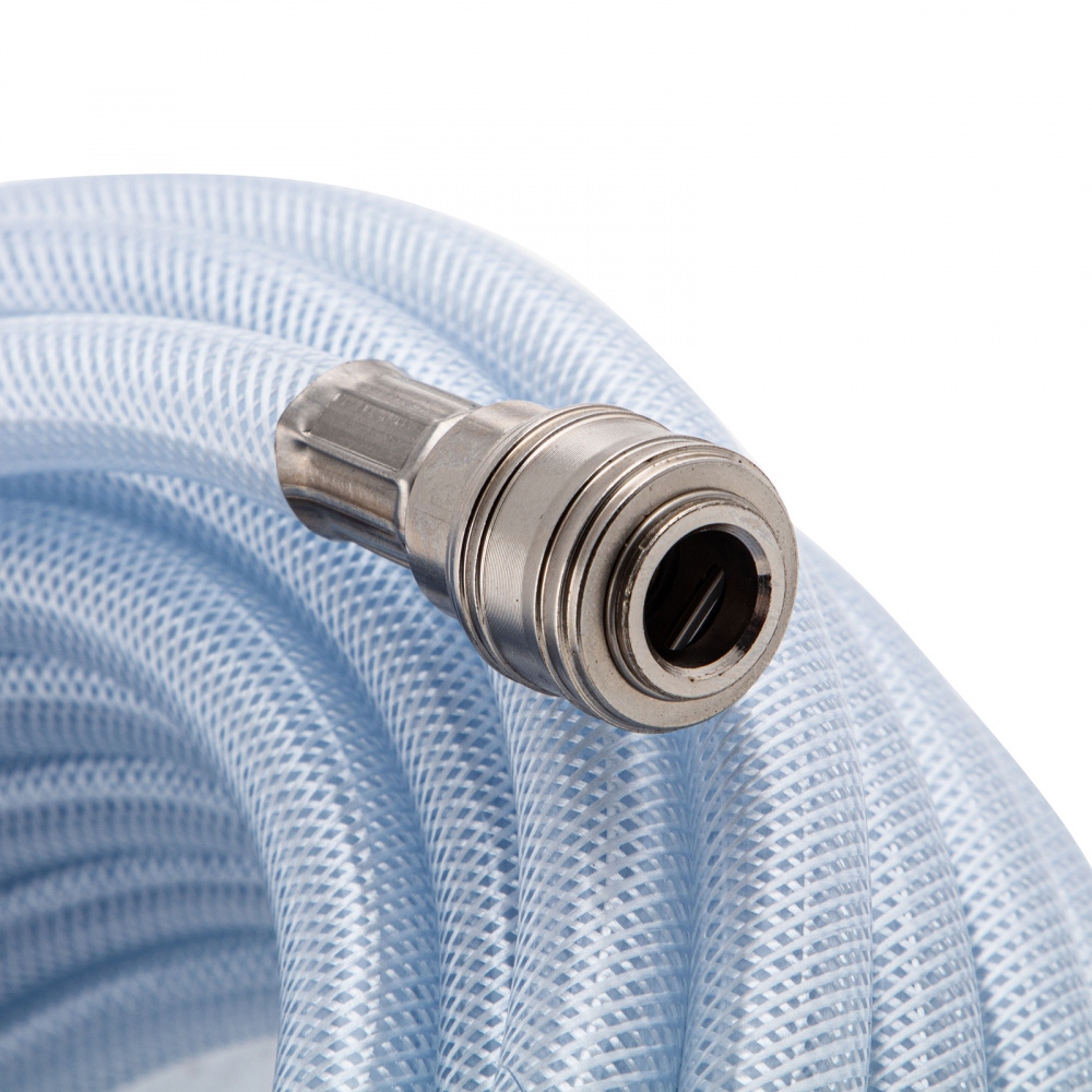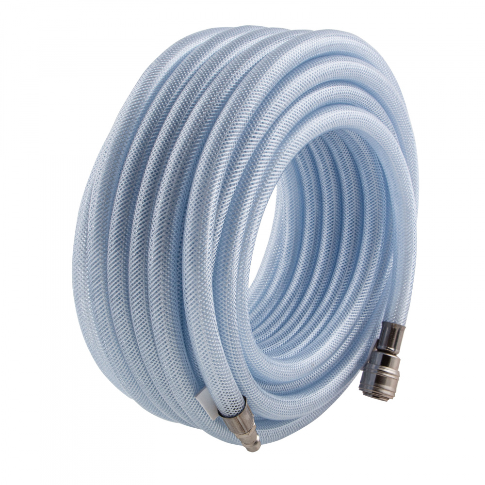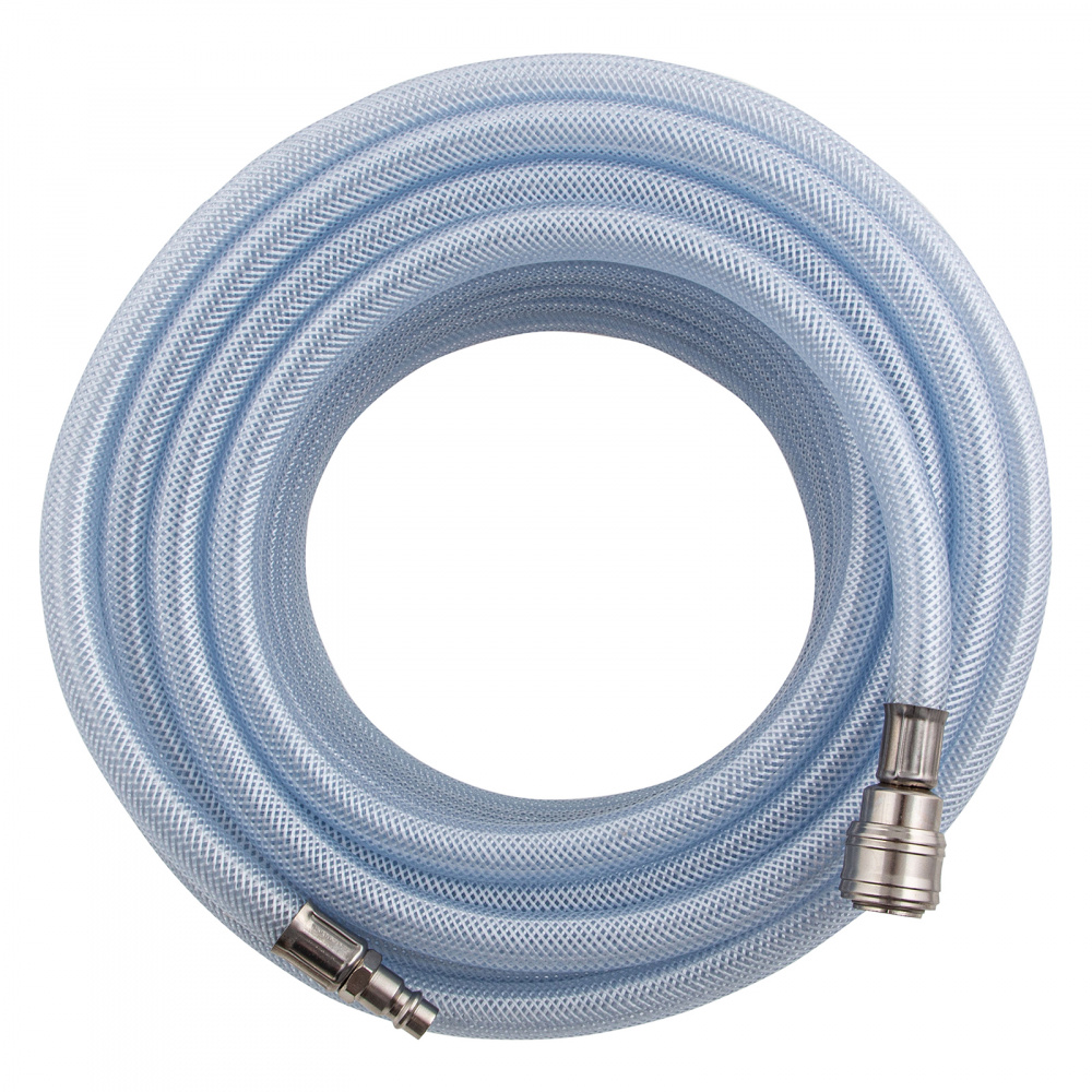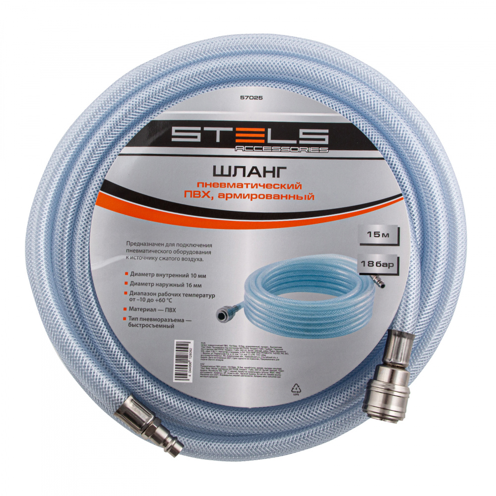 Армированный прозрачный пневматический шланг Stels 57025 из ПВХ, 10 х 16 мм, длиной 15 м, с быстросъемами, выдерживает давление до 18 бар и предназначен для соединения между собой мощных компрессоров и инструментов с пневматическим приводом, а также прокладки магистральной пневмолинии. Изготовлен из ПВХ и имеет армирующий слой из полиамида, поэтому характеризуется высокой прочностью и устойчивостью к падениям и пережатиям, а также невосприимчивостью к химическим воздействиям. Шланг подойдет для использования на производственном предприятии, строительной площадке или в автосервисе.