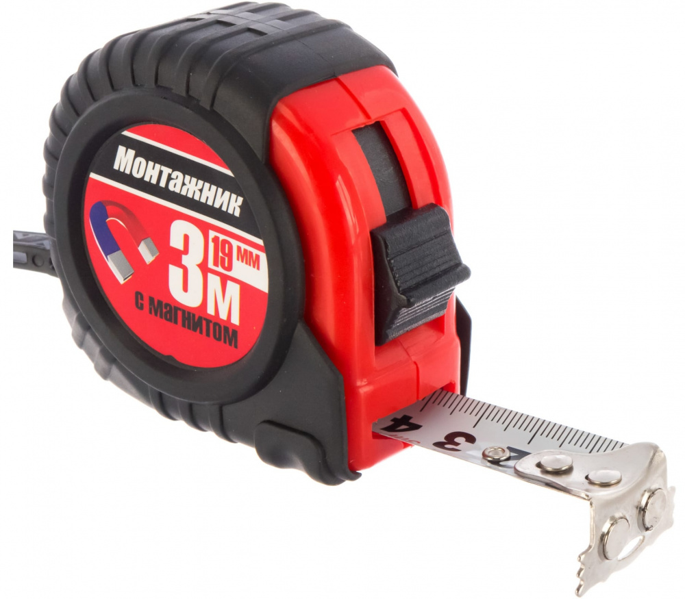 Рулетка с магнитом Монтажник в корпусе с элементами из эко-резины без запаха оснащена отверстием для зацепа на гвоздь, с мощной возвратной пружиной. Толщина стальной ленты всего 0.115 мм, ширина ленты - 19 мм