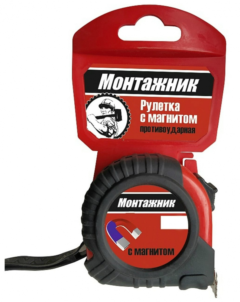 Рулетка с магнитом Монтажник в корпусе с элементами из эко-резины без запаха оснащена отверстием для зацепа на гвоздь, с мощной возвратной пружиной. Толщина стальной ленты всего 0.115 мм, ширина ленты - 25 мм