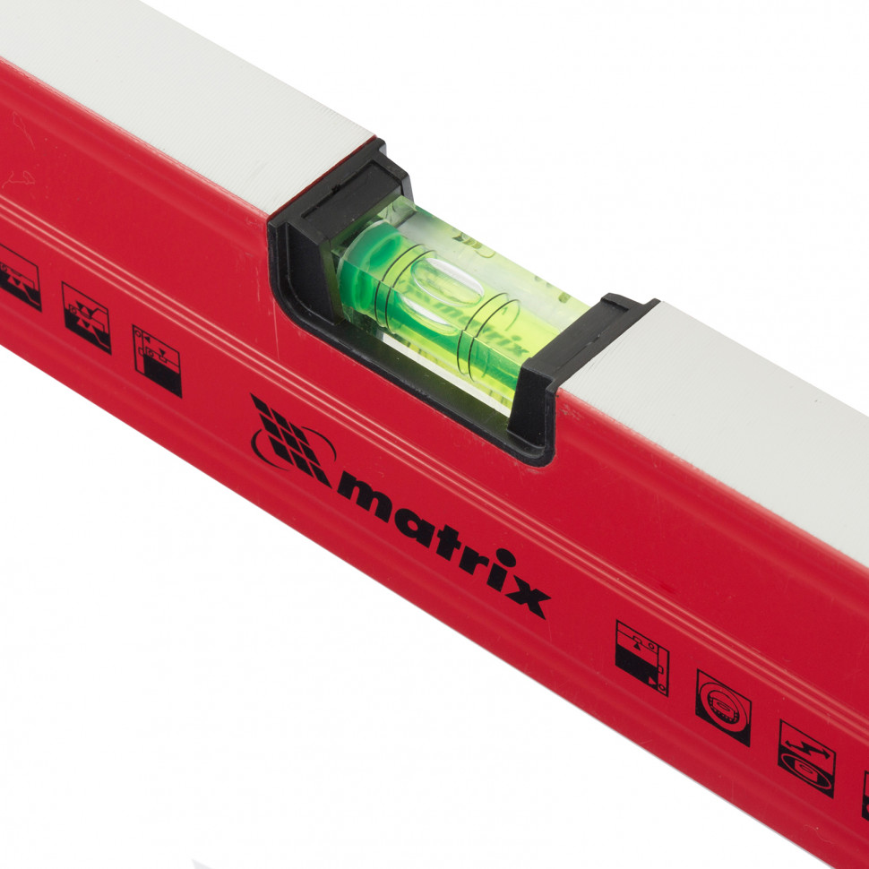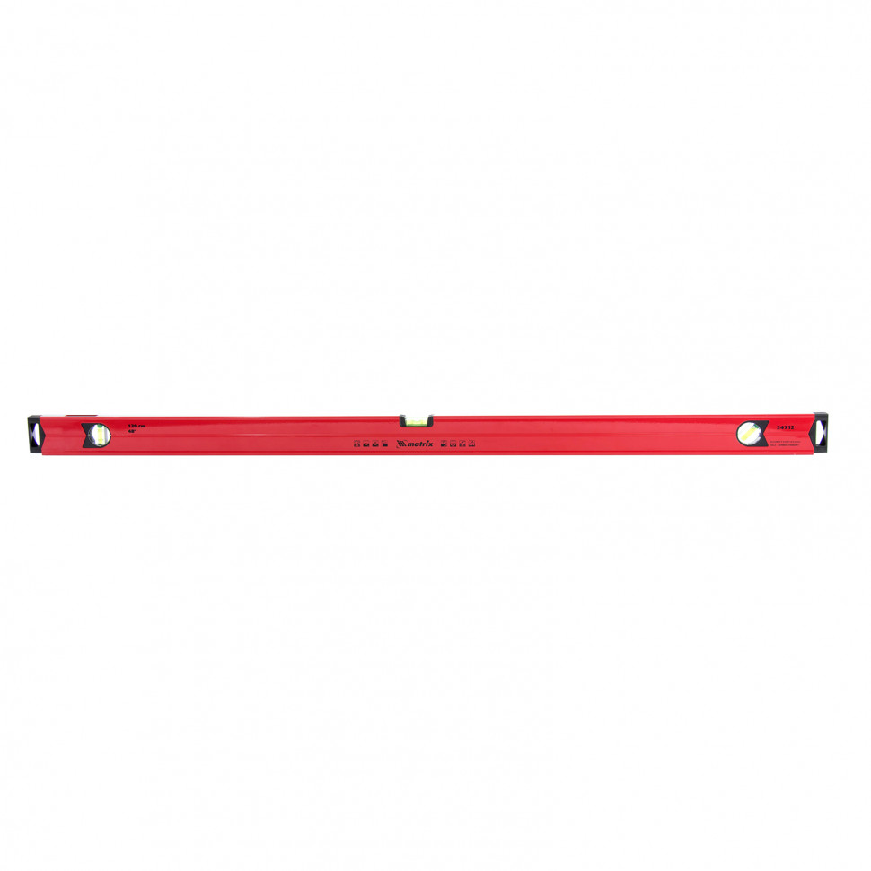 Алюминиевый магнитный уровень Matrix 34712 усиленной конструкции, длиной 1200 мм, с фрезерованной рабочей поверхностью, оснащен 3 глазками и одним зеркальным отражателем. Позволяет выявить отклонения от вертикали, горизонтали и угла 45°. Встроенный зеркальный глазок облегчает считывание показаний.
