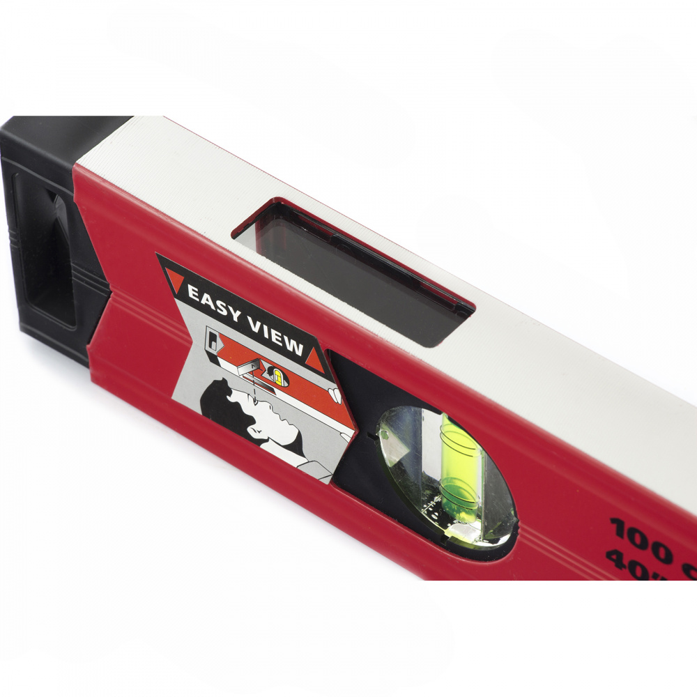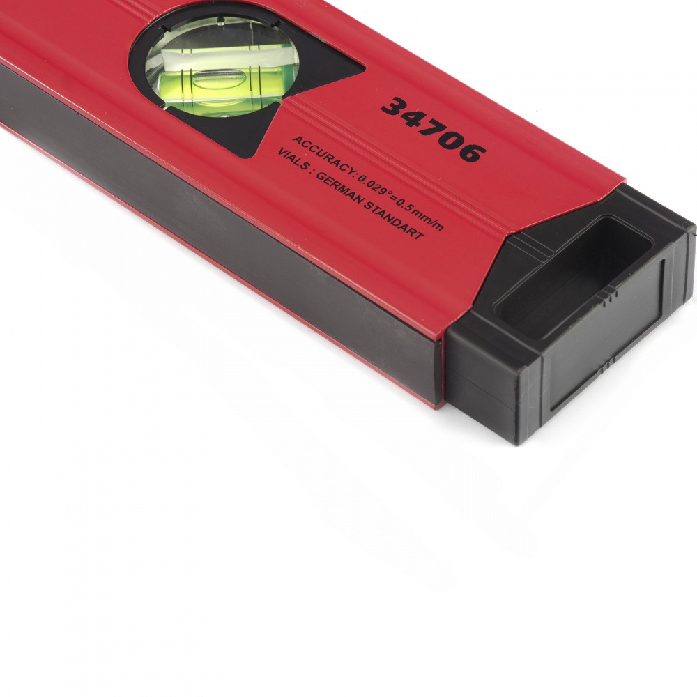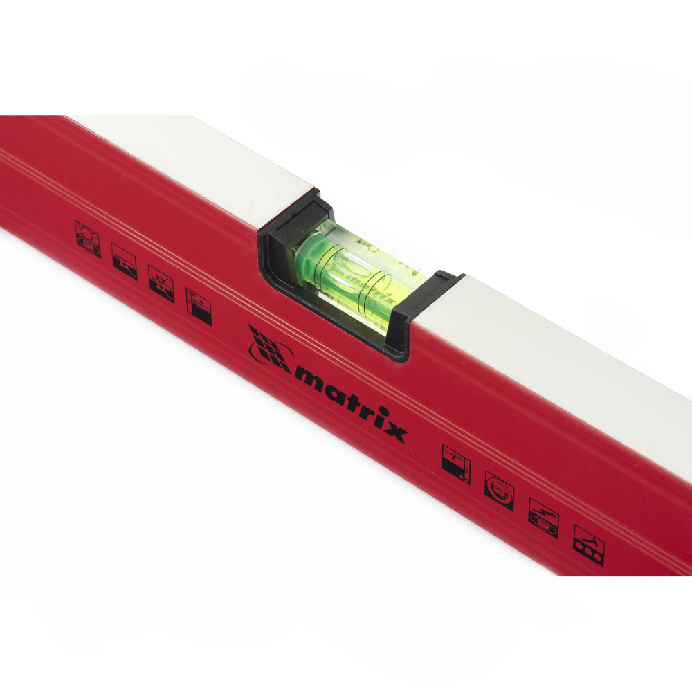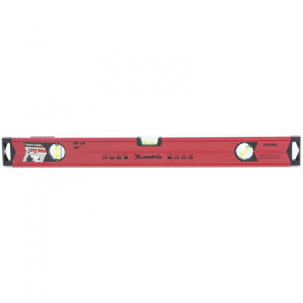 Алюминиевый магнитный уровень Matrix 34706 усиленной конструкции, длиной 600 мм, с фрезерованной рабочей поверхностью, оснащен 3 глазками и одним зеркальным отражателем. Позволяет выявить отклонения от вертикали, горизонтали и угла 45°. Встроенный зеркальный глазок облегчает считывание показаний.