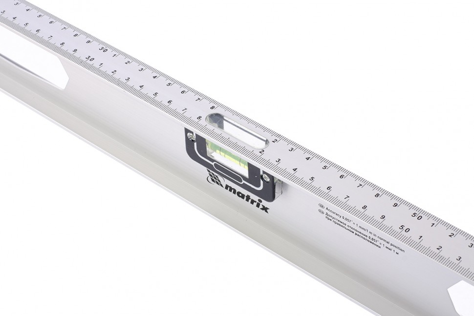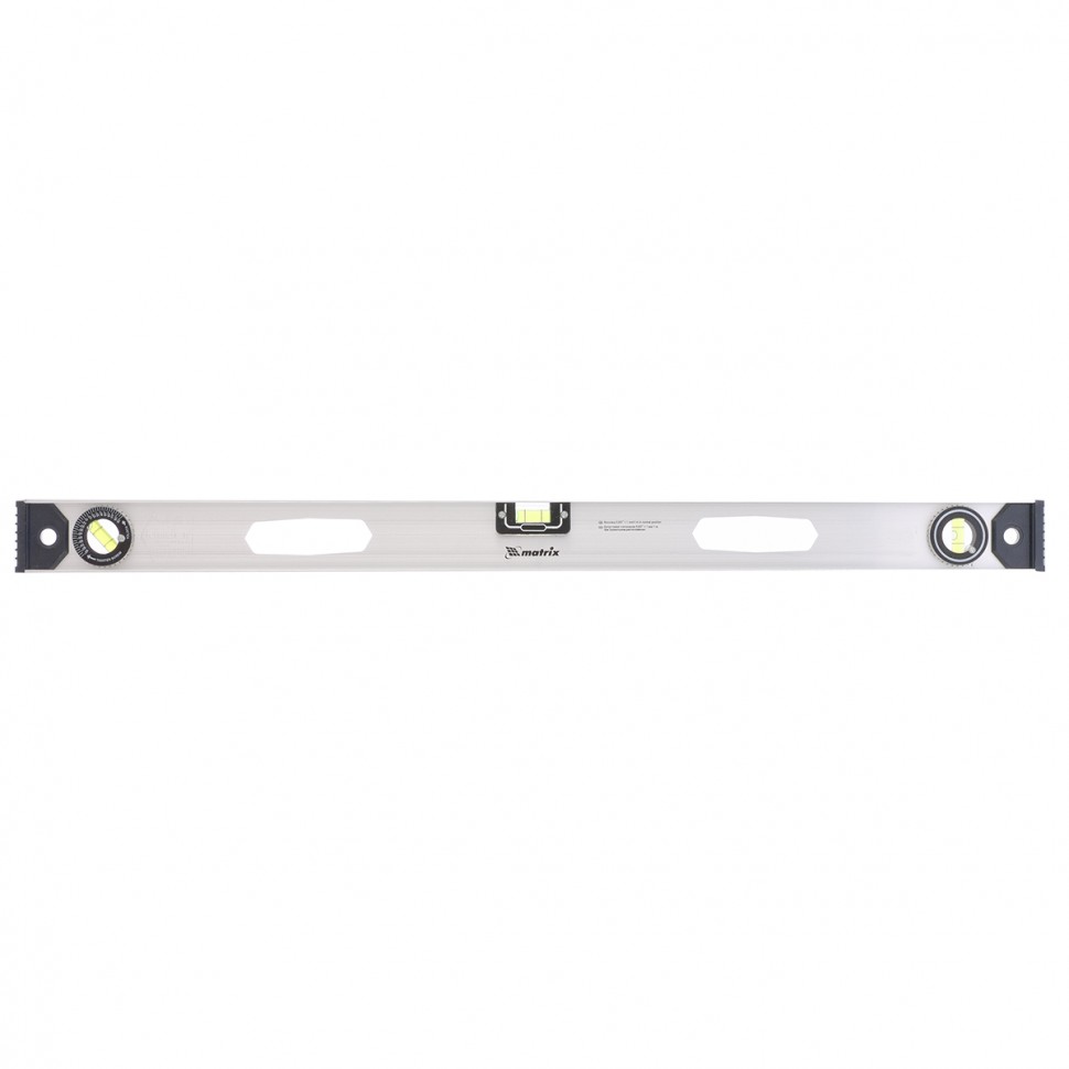 Алюминиевый уровень Matrix «Рельс» 34026 длиной 800 мм имеет 3 глазка: 2 для проверки отклонений от заданной вертикали и горизонтали и 1 поворотный для проверки наклонных поверхностей.
