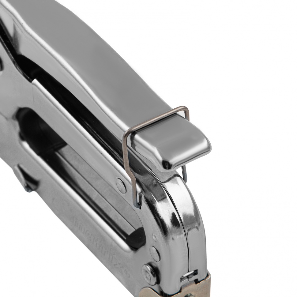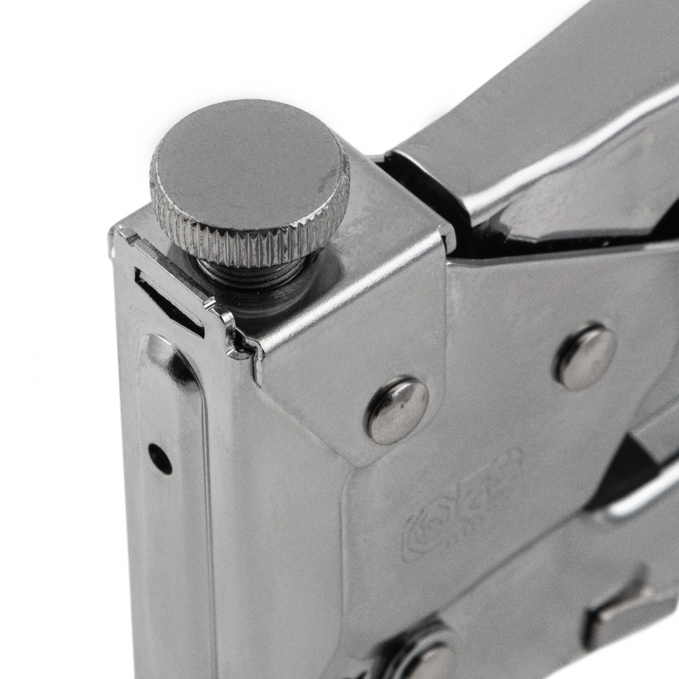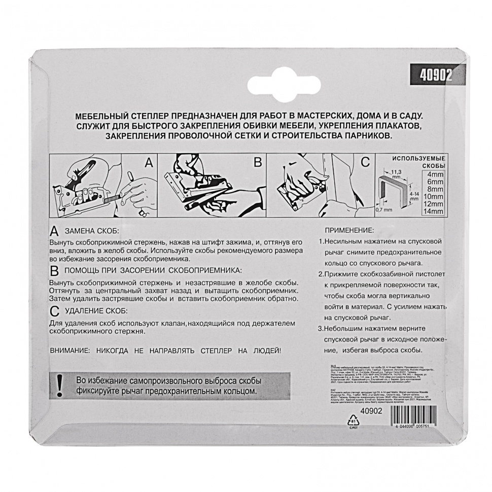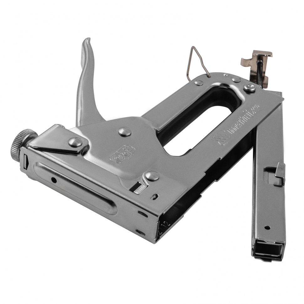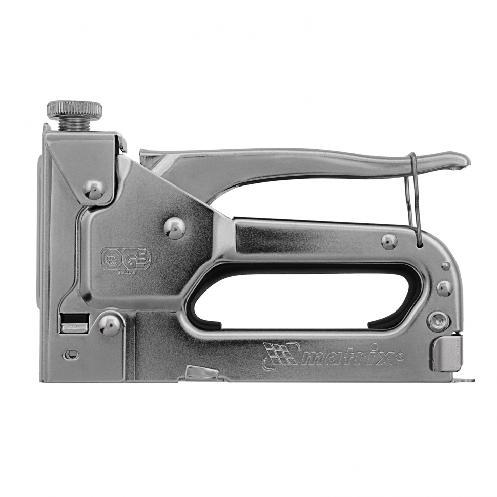 Регулируемый мебельный степлер Matrix 40902, предназначенный для скоб типа 53 размером 4-14 мм, используется для быстрого скрепления с деревянным основанием листовых материалов — фанеры, картона, оргалита, ДВП, ДСП, пленки или утеплителя. Корпус изготовлен методом штамповки из высококачественной стали, поэтому прочен и долговечен. Степлер пригодится для сборки и обивки мебели, монтажа теплоизоляции, а также будет полезен в быту.