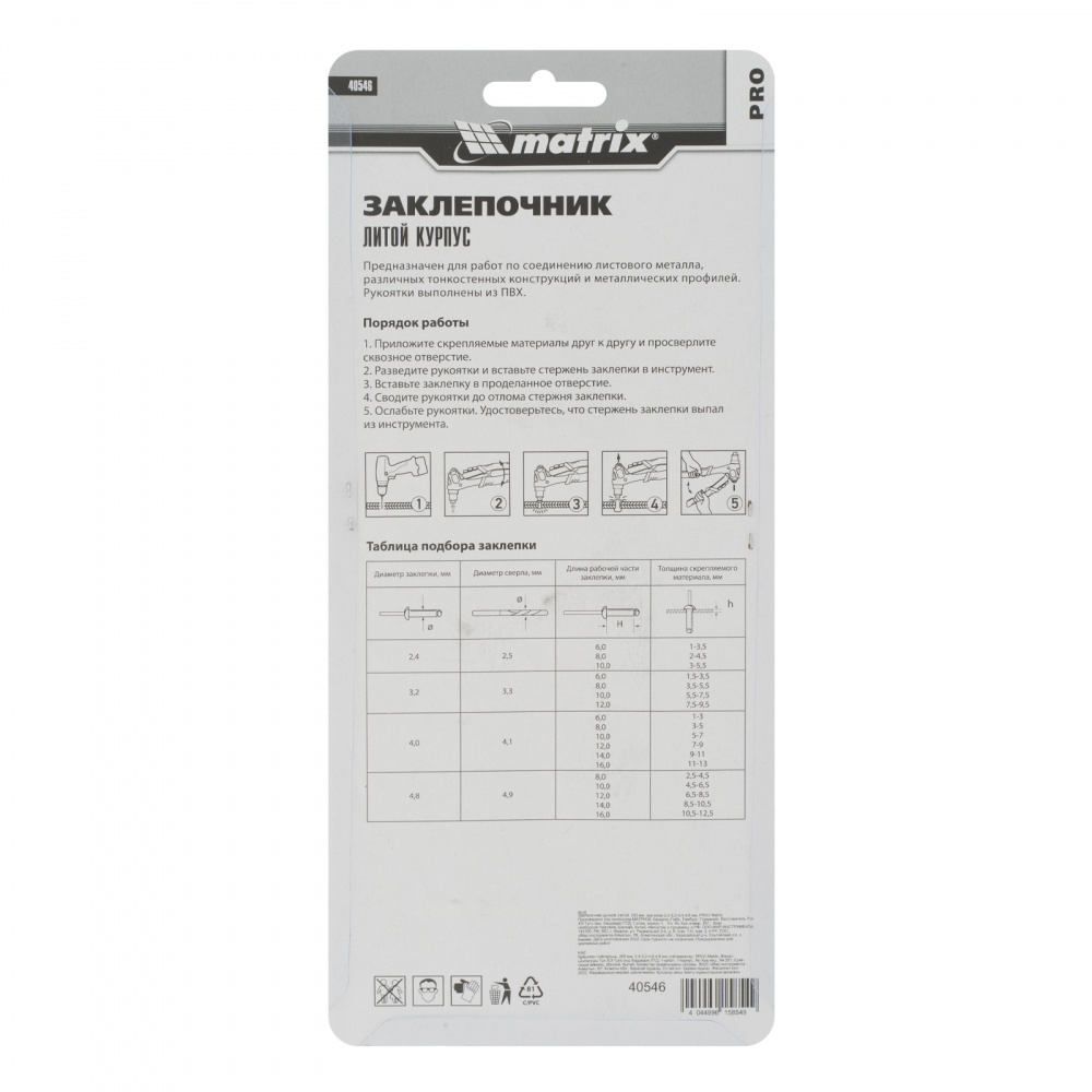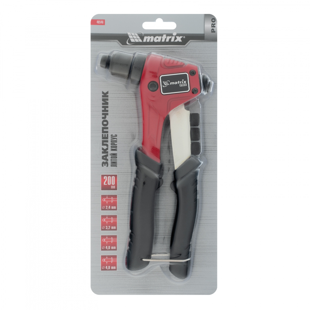Ручной литой заклепочник Matrix PRO 40546 длиной 200 мм позволяет скреплять металлические заготовки с помощью вытяжных заклепок диаметром 2,4-3,2-4,0-4,8 мм. Обеспечивает прочность и надежность соединений. Инструмент пригодится как частному мастеру, так и профессионалу при проведении ремонта, установке забора и выполнении других работ.