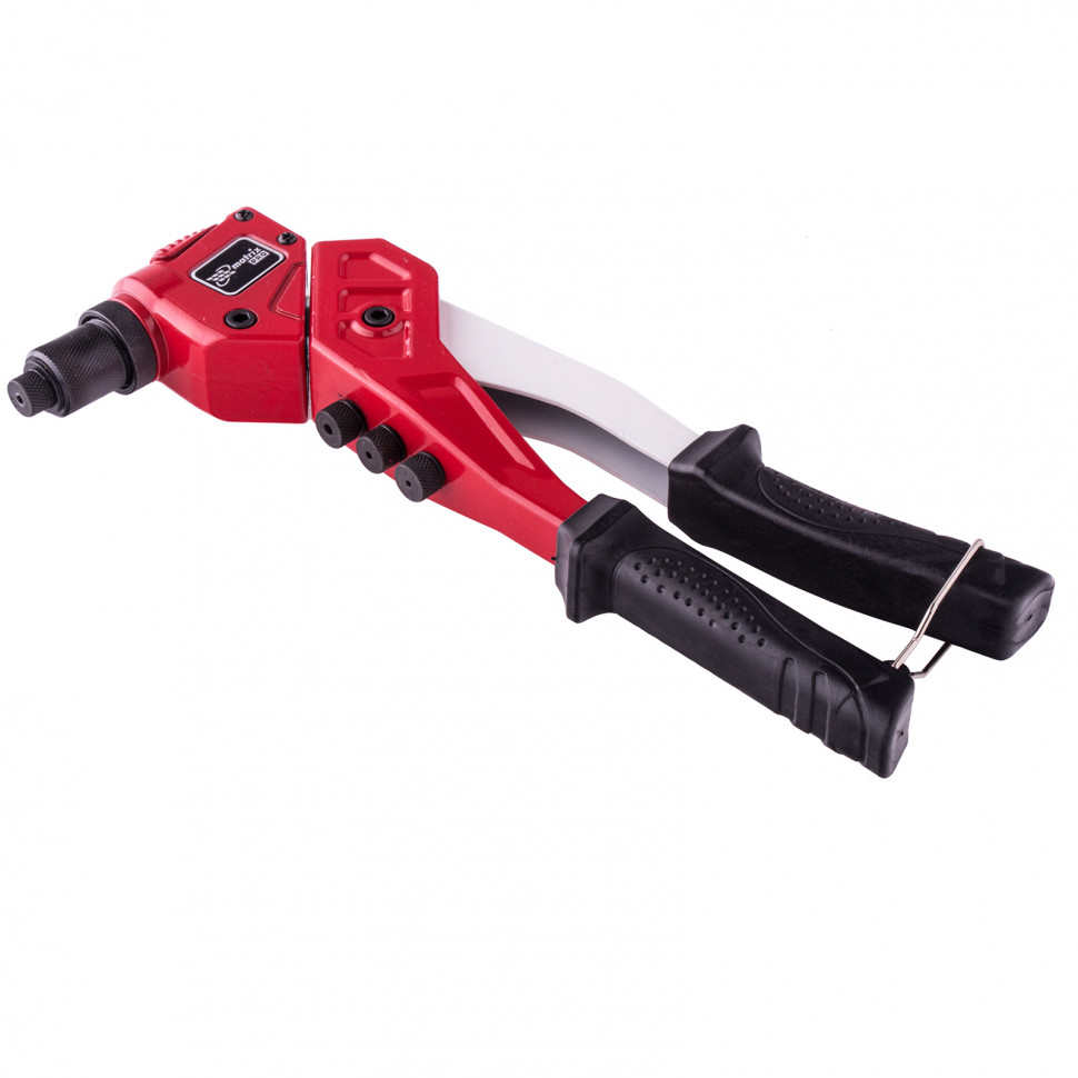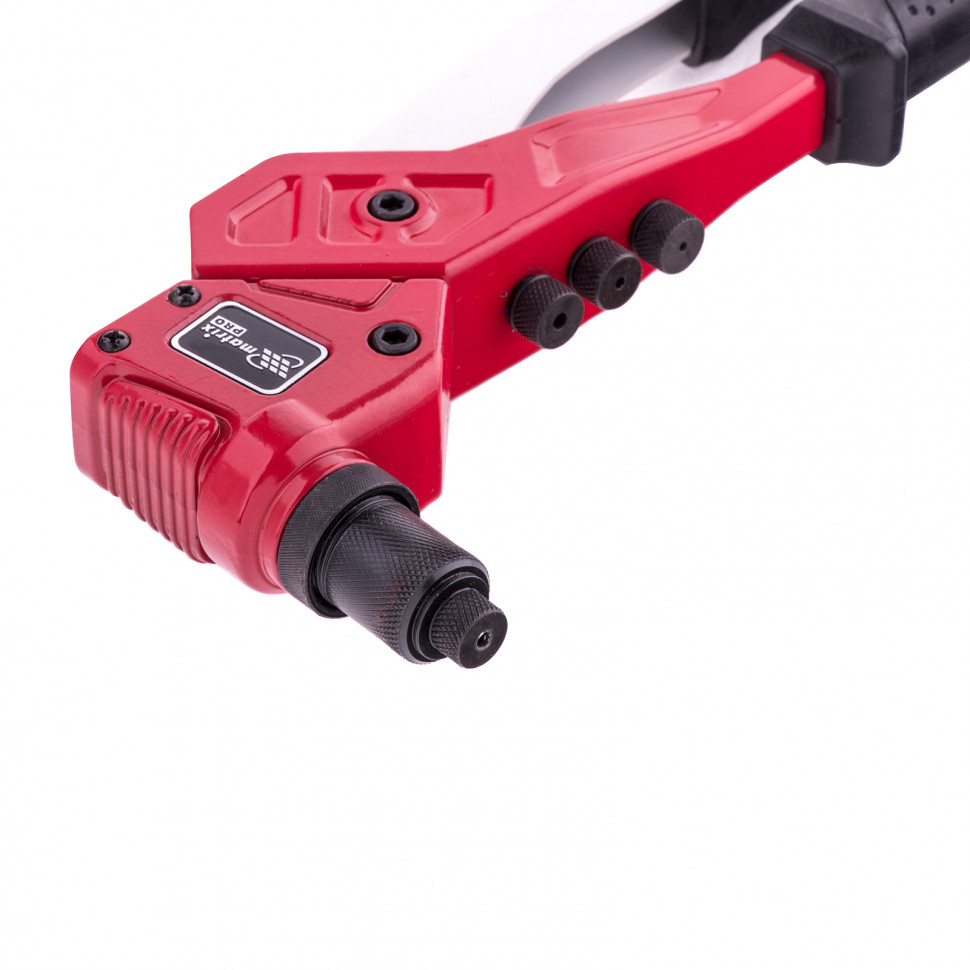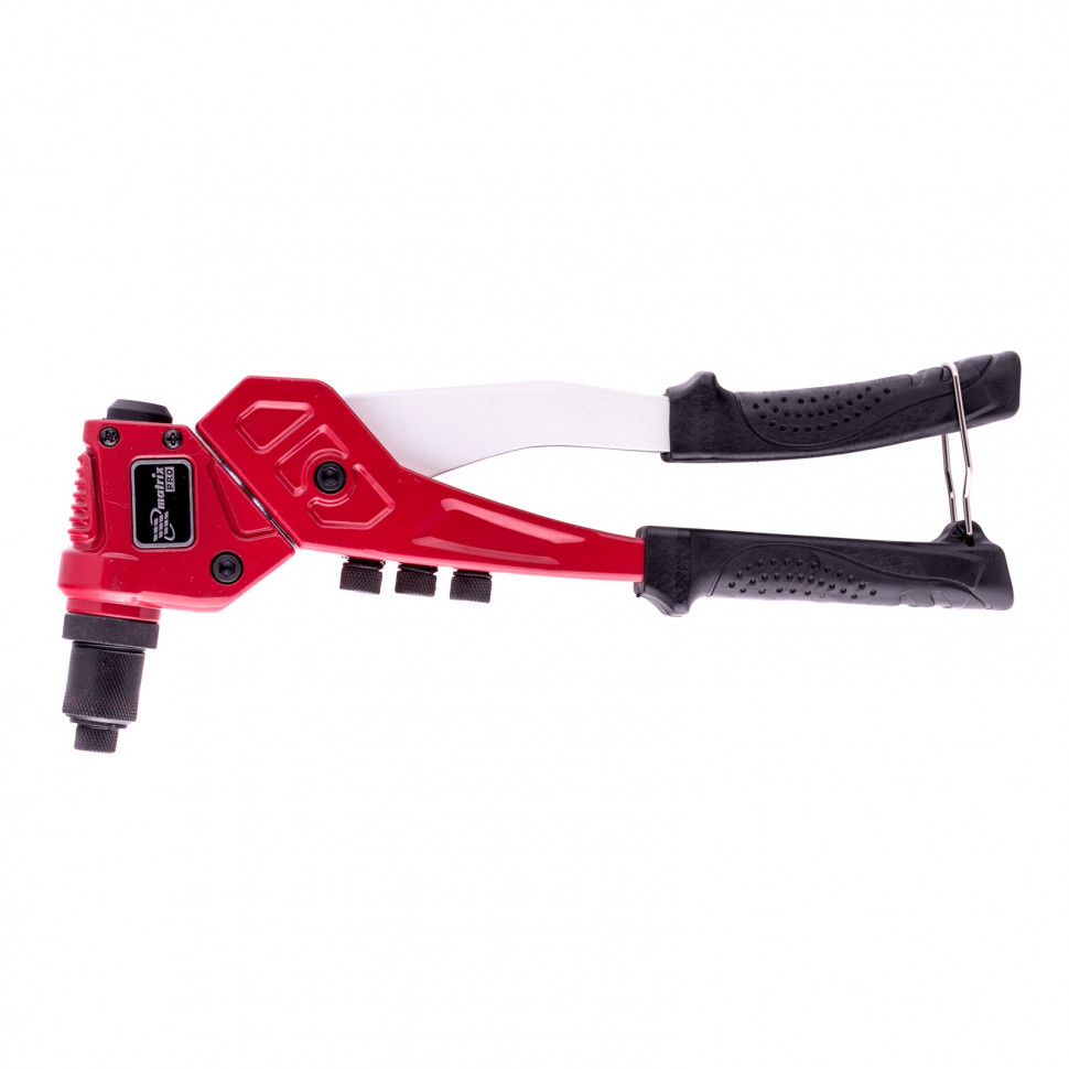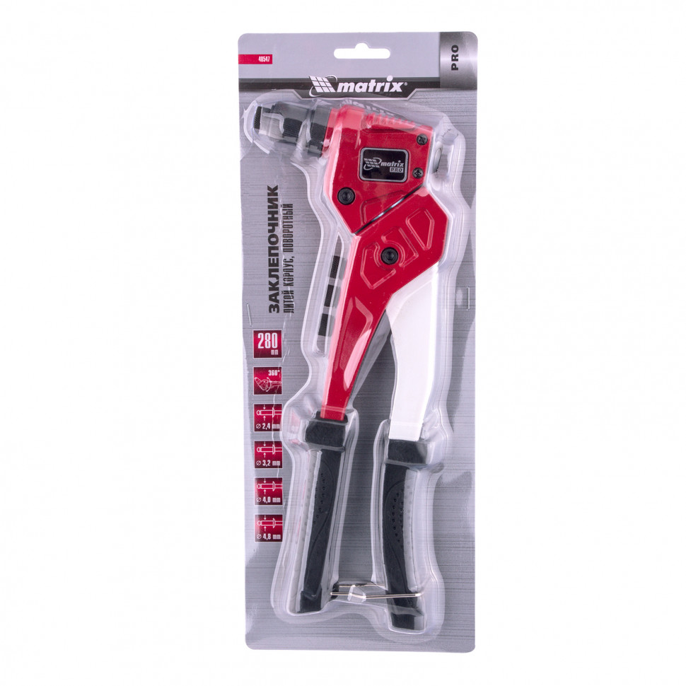 Заклёпочник ручной литой Matrix PRO 40547 длиной 290 мм, поворотный 0-360 градусов, используется для создания неразъёмных соединений с помощью вытяжных заклёпок типоразмера 2,4-4,8 мм. Голова инструмента вращается на 360 градусов, что упрощает работу в стеснённых условиях. Заклёпочник пригодится на производстве, в ремонтной мастерской или в быту.