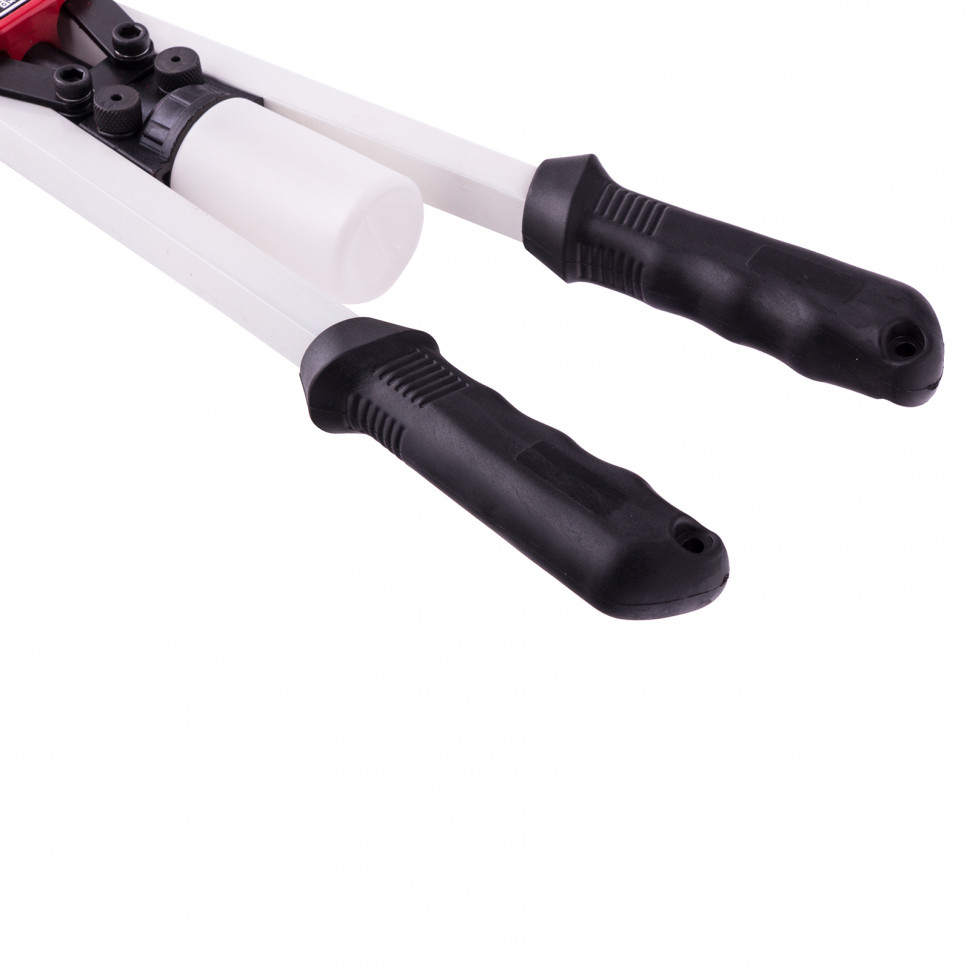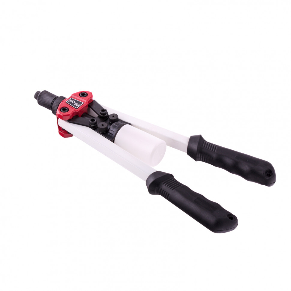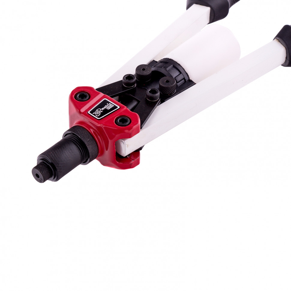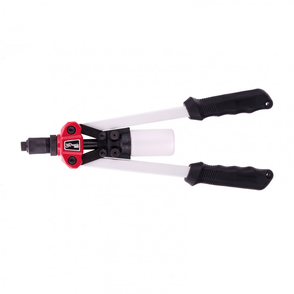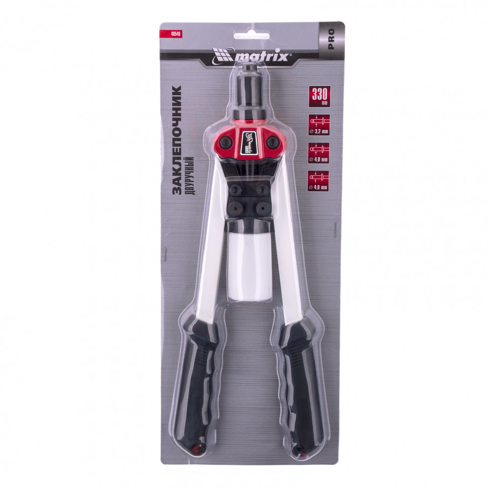 Двуручный заклёпочник Matrix PRO 40549 длиной 330 мм, используется для соединения металлических листов и профилей с помощью вытяжных заклёпок диаметром 3,2-4,0-4,8 мм. Заклёпочник для работ двумя руками позволяет перераспределить нагрузку с кисти (в сравнении с заклёпочниками для работы одной рукой) на две руки. Инструмент применяется в профессиональной и бытовой сфере.