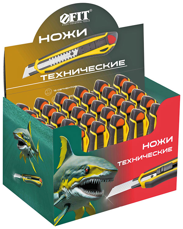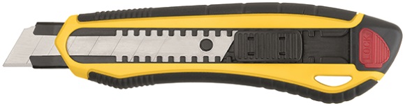 «Отламывающееся» лезвие с пластиковым прижимом. Металлическая направляющая с двусторонней автофиксацией для усиления конструкции. Отсек для хранения запасных лезвий. Материал: прорезиненный корпус из ударопрочного ABS пластика, лезвие из высоко-углеродистой стали.