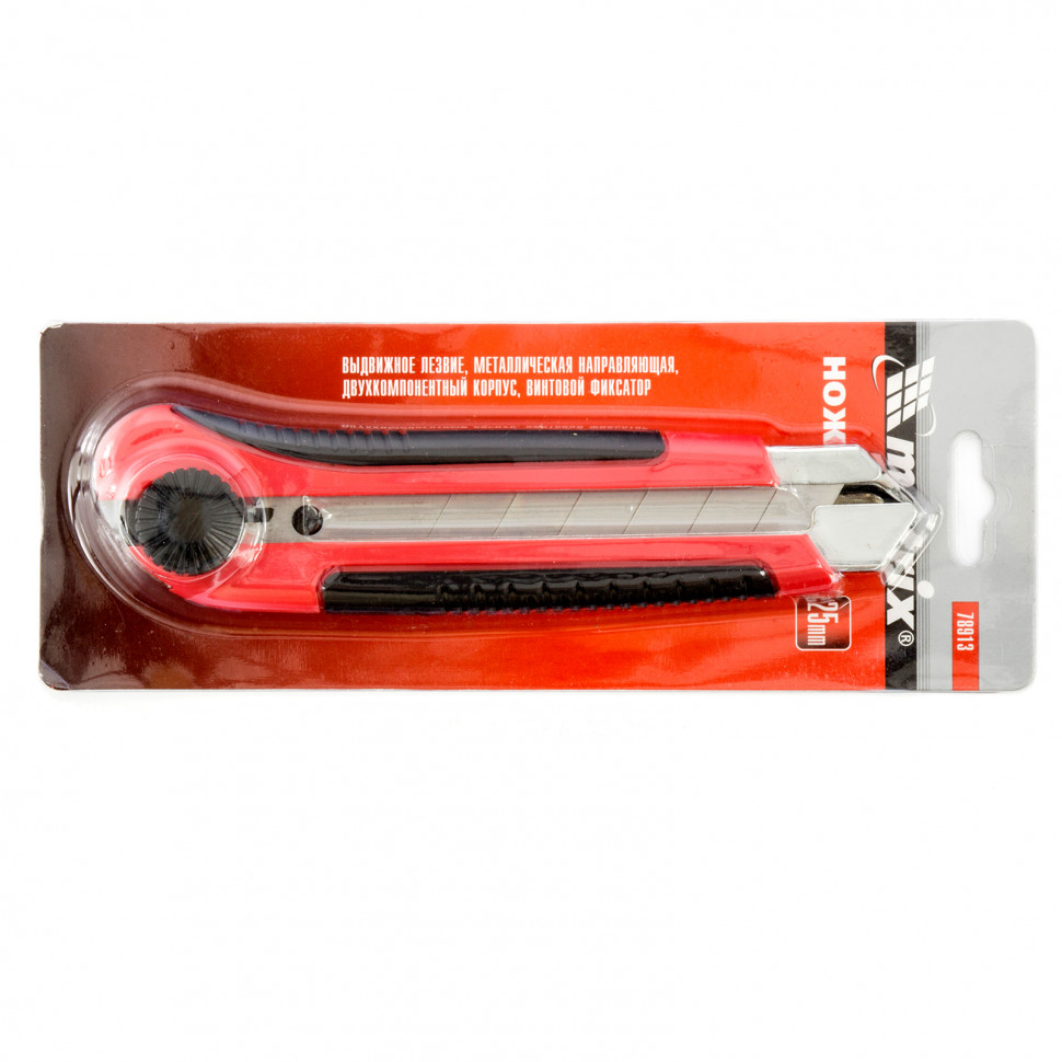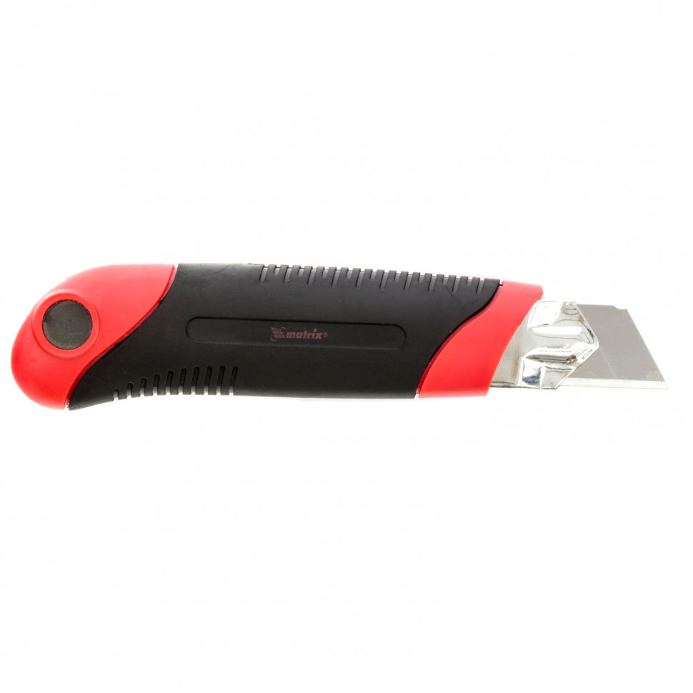 Нож Matrix 78913 в двухкомпонентном корпусе, с выдвижным лезвием шириной 25 мм, металлической направляющей, винтовым фиксатором и магнитом, применяется для разрезания картона, линолеума, ковролина, обоев, пленки, кожи и других мягких материалов. Лезвие выдвигается на необходимую длину и удерживается в этом положении при помощи винтового фиксатора. Нож пригодится при проведении отделочных и ремонтных работ, а также поможет в решении бытовых задач.
