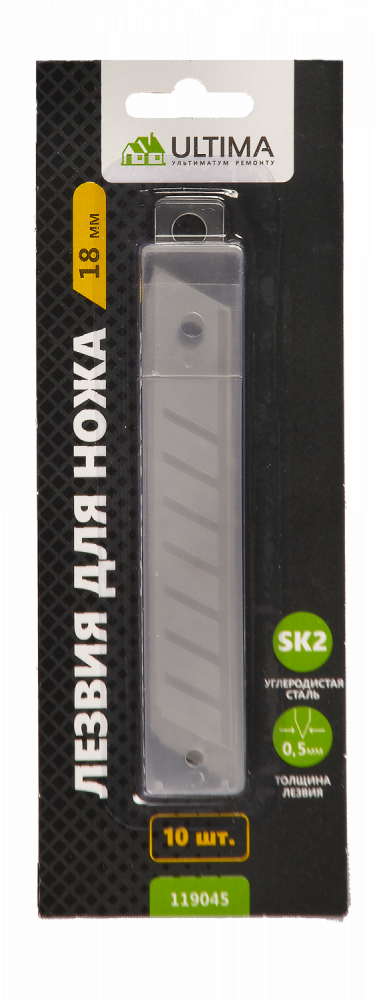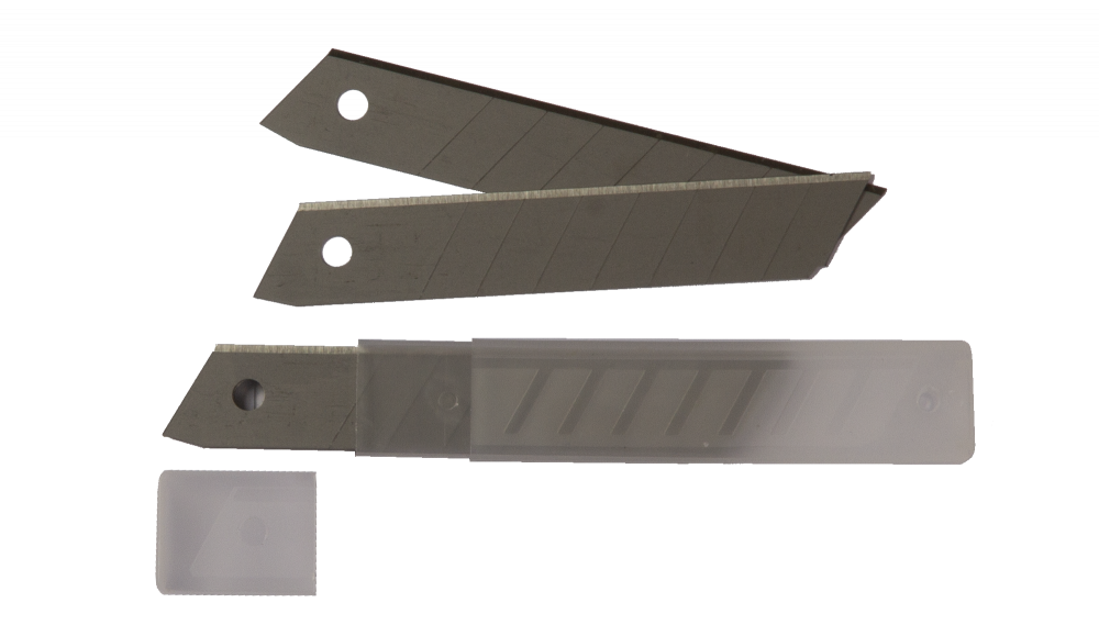 Лезвия для ножей изготовлены из инструментальной стали У12А (SK2). Оснастка поставляется в пластиковой упаковке и блестере, удобной для транспортировки и хранения. Двойная заточка обеспечивает сохранность лезвия острым в течение долгого времени. Можно резать различные материалы, например, ковровые покрытия, картон, линолеум и другие. Лезвие насчитывает 8 сегментов.