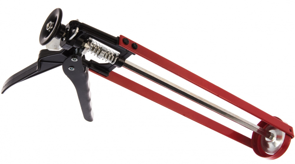 Скелетный усиленный пистолет для герметика торговой марки "Монтажник" с системой Антикапля (Non drop), которая уменьшает вытекание герметика при прекращении давления на курок - шток отводится немного назад, давление в баллоне ослабевает и герметик сразу перестаёт вытекать. Имеется специальная игла для прокалывания герметика, застывшего на носике баллона. Материал корпуса - металл