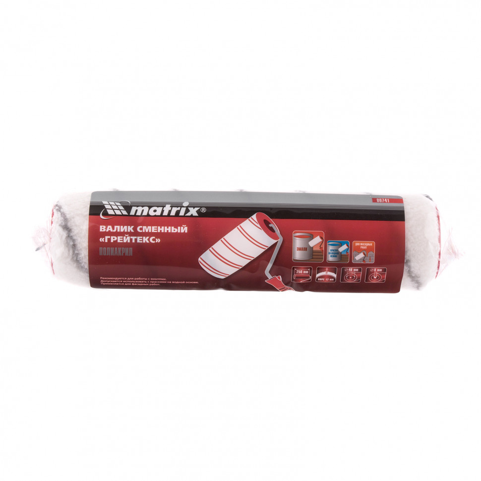 Сменный валик Matrix «ГРЕЙТЕКС» 80741 с ворсом из полиакрила 12 мм, шириной ролика 250 мм и диаметром 48 мм устанавливается на бюгель диаметром 8 мм. Ворс средней длины позволяет полностью прокрашивать не только гладкие, но и шероховатые поверхности. Применяется для нанесения лаков, красок, эмалей, а также иных лакокрасочных материалов во время проведения внутренних и наружных отделочных работ.