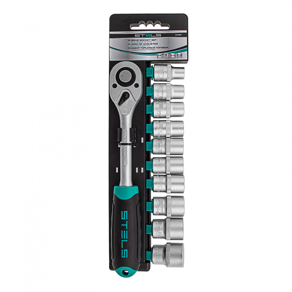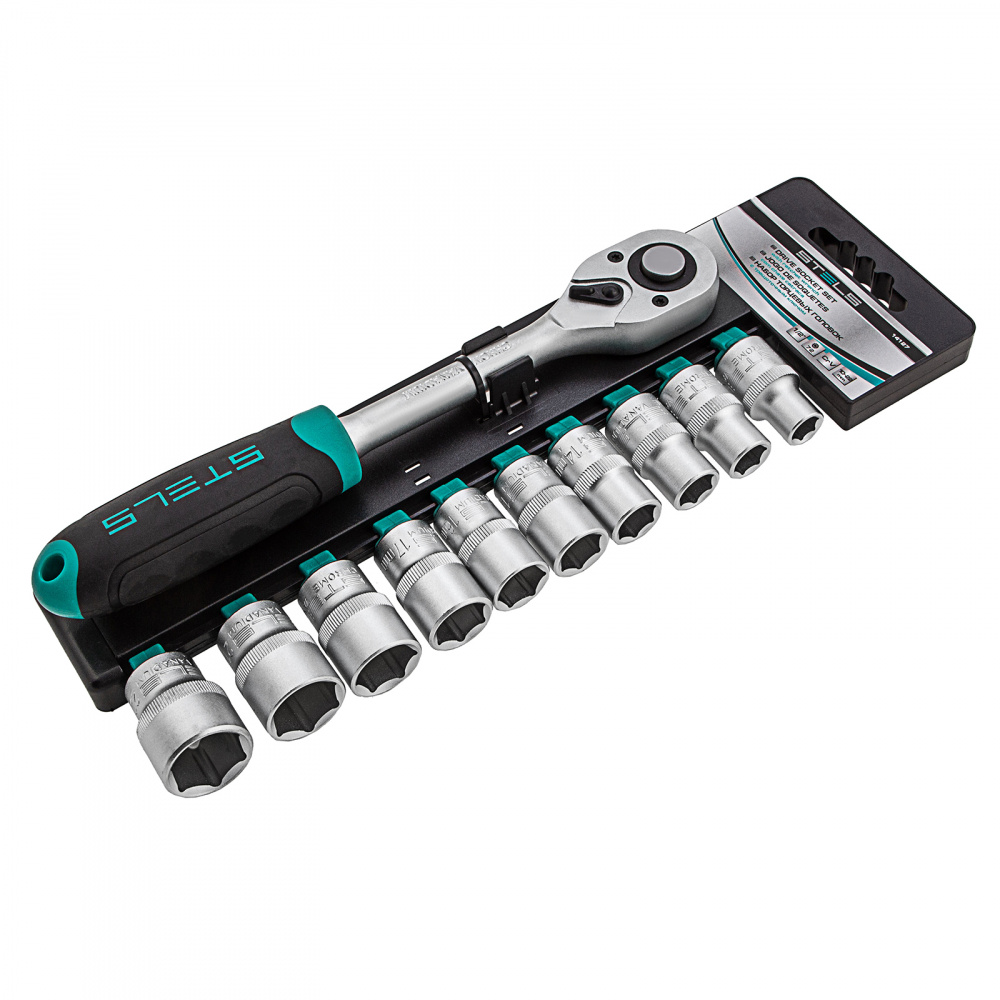 Набор Stels 14127, CrV, включает в себя 11 предметов: торцевые головки 10-22 мм с хвостовиком 1/2 дюйма и трещоточный ключ. Он используется для закручивания и раскручивания крепежных элементов, пригодится при ремонте крупногабаритной техники и обслуживании авто. Инструменты выдерживают высокие нагрузки и могут использоваться в ограниченном пространстве.