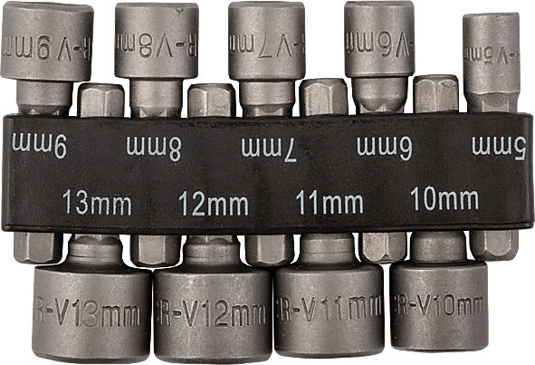 В наборе: 9 головок (5; 6; 7; 8; 9; 10; 11; 12; 13 мм). Для применения с электроинструментом. Материал: закаленная хром-ванадиевая сталь. Упаковка: блистер.