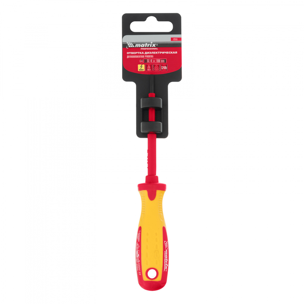 Отвертка Matrix Insulated 12916, SL4,0 x 100 мм, из стали CrMo, с двухкомпонентной рукояткой до 1000 В, используется при проведении ремонтных с крепежом типа Slotted «минус». Благодаря диэлектрическому покрытию она выдерживает напряжение до 1000 В, поэтому оптимально подходит для настройки электрооборудования, установки розеток и др. Важно — техника безопасности запрещает работать под напряжением!