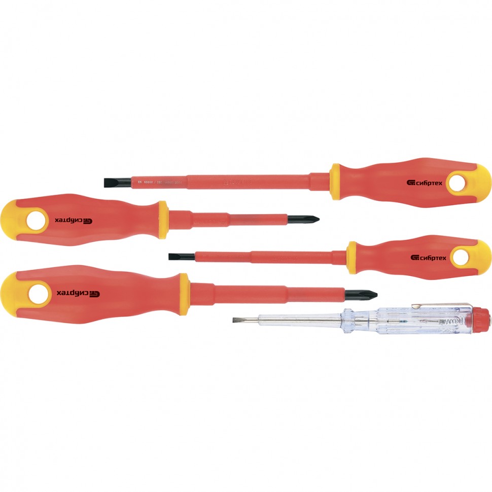 Набор диэлектрических отверток и тестер Сибртех 12937, CrV, с двухкомпонентными рукоятками, состоит из 5 предметов, которые пригодятся при обслуживании электрооборудования и электроприборов. Диэлектрическое покрытие защищает оператора от поражения током во время работ под напряжением до 1000 В. Широкий диапазон длины стержней отверток 80-125 мм позволяет выбрать оптимальную в зависимости от степени углубления крепежа. Важно — техника безопасности запрещает работу под напряжением даже при использовании инструмента с диэлектрическим покрытием!