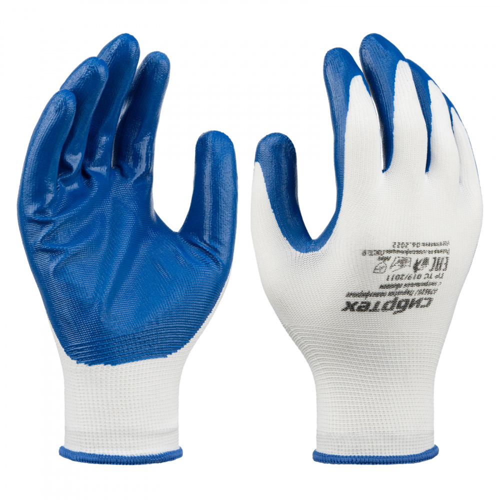 Полиэфирные перчатки Сибртех с нитрильным покрытием, предназначены для защиты рук от механических воздействий и общепроизводственных загрязнений при выполнении хозяйственных, ремонтных, строительных работ